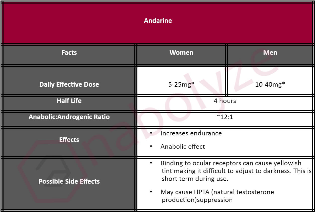 Andarine was developed to treat conditions such as muscle wasting, osteoporosis and benign prostatic hypertrophy. It is less potent in both anabolic and androgenic effects than other SARMs, but even though it may be weakest in anabolic activity, it is one of the most androgenic, being 1/3 as strong as testosterone at binding to the androgen receptor.