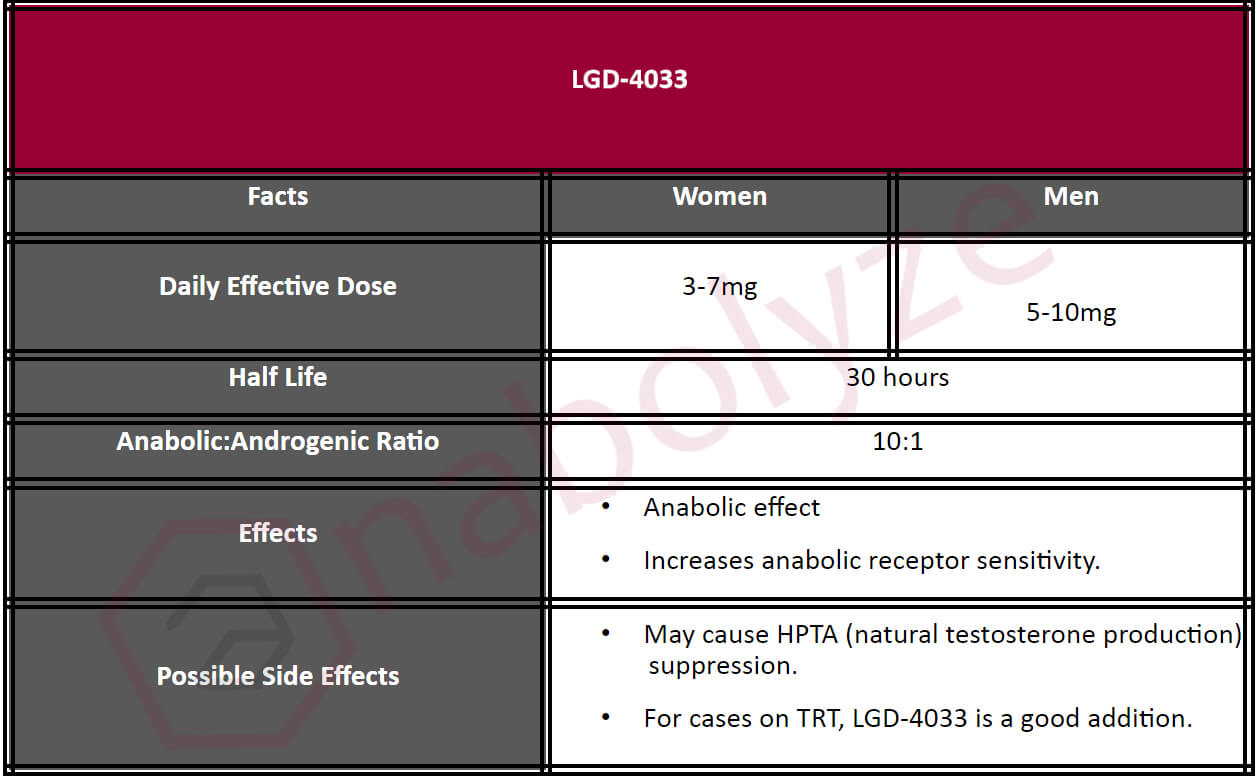 LGD-4033 developed to treat muscle wasting and osteoporosis, is a nonsteroidal, oral selective androgen receptor modulator which binds to the androgen receptor with high affinity and selectivity.Tests have shown increased lean body mass and decreased body fat. It has also shown significant increase in strength, well-being and healing properties.